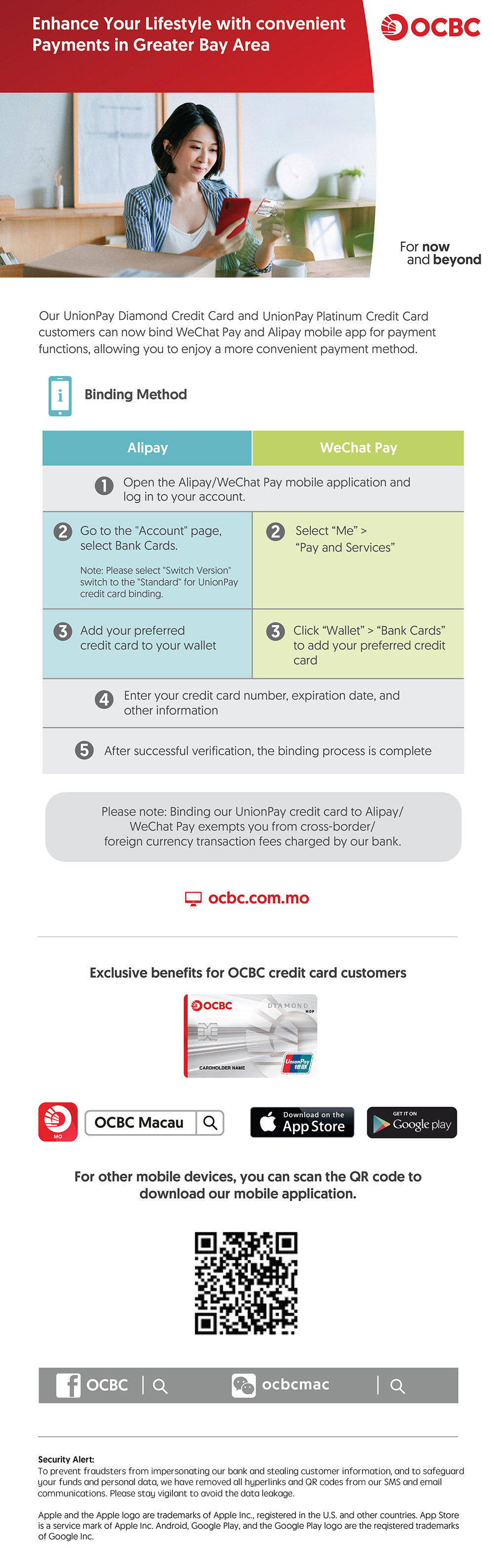 Cardholders can register OCBC Macau UnionPay Diamond or UnionPay Platinum credit card via WeChat Pay and Alipay mobile app. After successful registration, you can make payments anytime by scanning the QR code. Allowing you to enjoy a more convenient payment method for a more enjoyable travel experience.